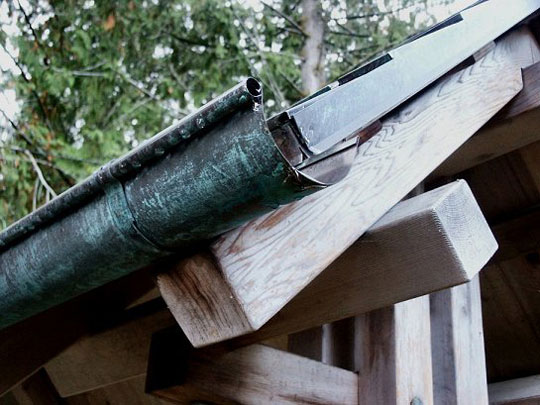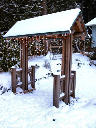 A welcoming portal that I built before timber framing was part of my design palette. Nonetheless, this garden gate has served as a test bed for concepts that have carried into subsequent timber frame designs. The beautifully patinated copper roof and naturally grayed cedar demonstrate the Japanese concept of wabi sabi, the beauty of old and new.